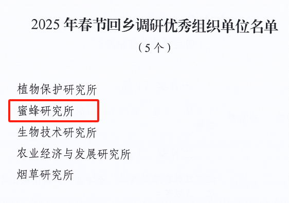 042025/07蜜蜂所获中国农业科学院“两优一先”表彰近日,中国农业科学院举办庆祝中国共产党成立104周年主题活动。会上宣布中国农科院蜜蜂研究所科研第四党支部获评院2023-2024年度先进基层党组织,中华蜜蜂保护与利用团队首席黄家兴研究员获院2023-...